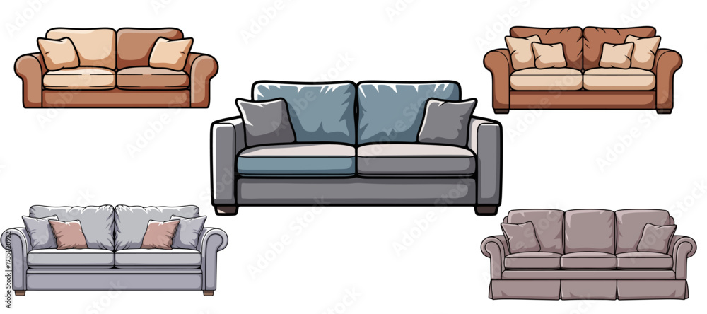 Set of Modern Sofa Illustrations in Different Styles and Colors for Interior Design and Furniture Catalog Concepts #1935020922
