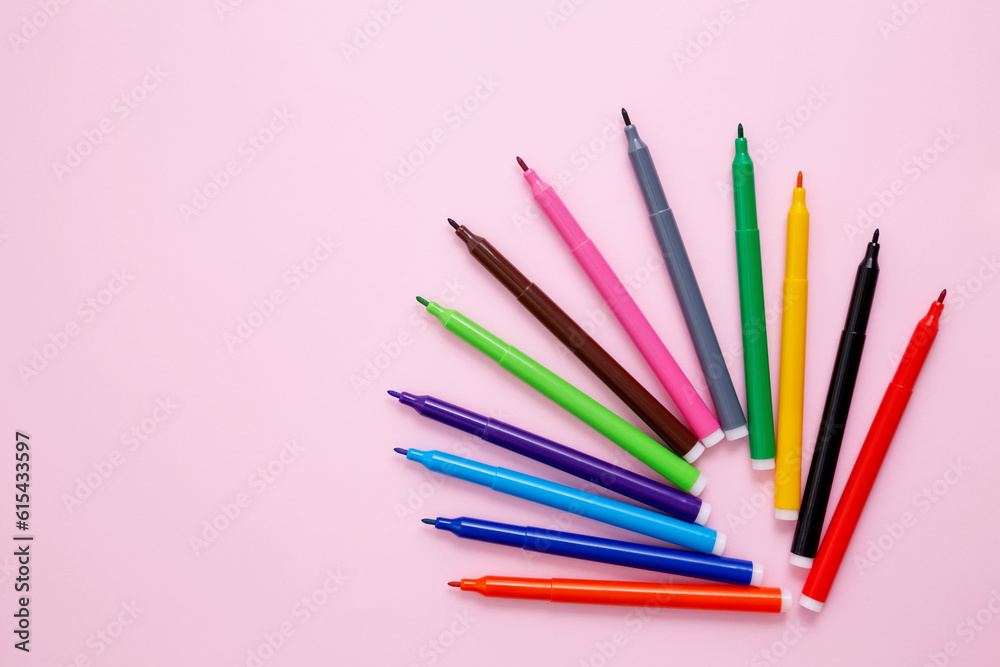 Set of multicolored felt-tip pens on pink background. Back to school. Flat lay. Copy space #615433597