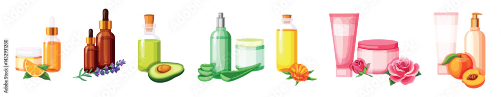 Set of organic cosmetics in cartoon style. Vector illustration of natural cosmetics: serums, jars, cream tubes, dispenser, spray, bottles.Orange, lavender, avocado, calendula,rose, peach in cosmetics. #1432931280