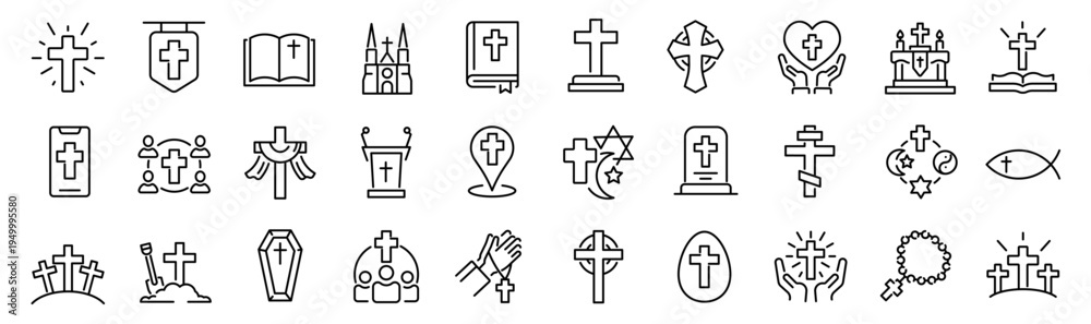 Set of 30 outline icons related to christian cross. Linear icon collection. Editable stroke. Vector illustration #1949995580