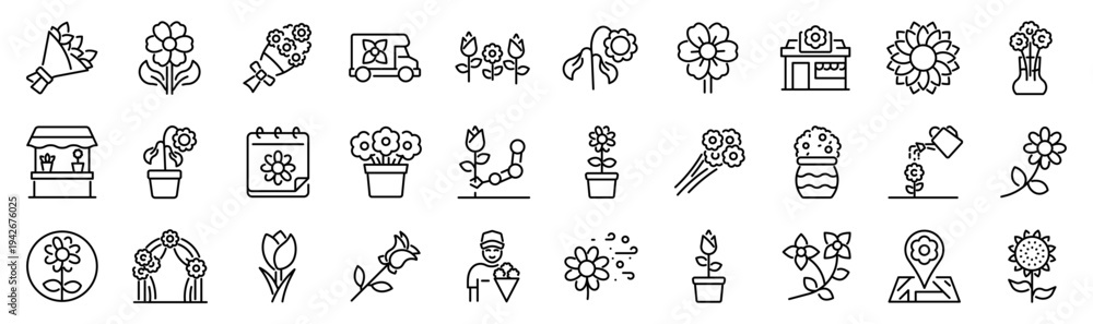 Set of 30 outline icons related to flower. Linear icon collection. Editable stroke. Vector illustration #1942676025