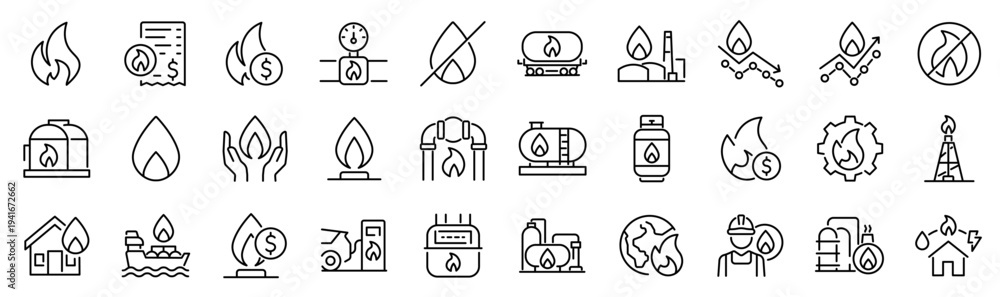Set of 30 outline icons related to natural gas. Linear icon collection. Editable stroke. Vector illustration #1941672662