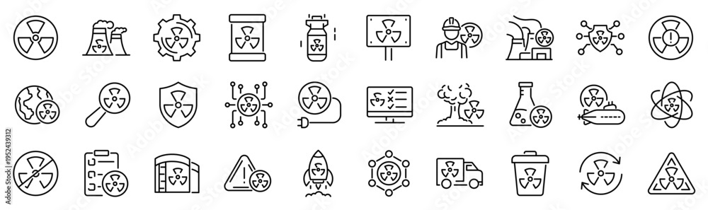 Set of 30 outline icons related to nuclear sign. Linear icon collection. Editable stroke. Vector illustration #1952439312
