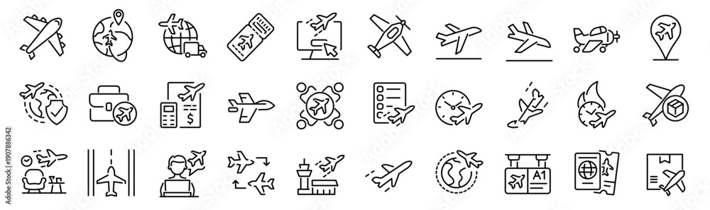 Set of 30 outline icons related to plane. Linear icon collection. Editable stroke. Vector illustration #1907886342