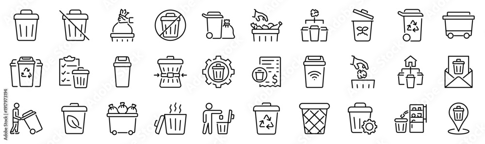 Set of 30 outline icons related to trash bin. Linear icon collection. Editable stroke. Vector illustration #1917973194