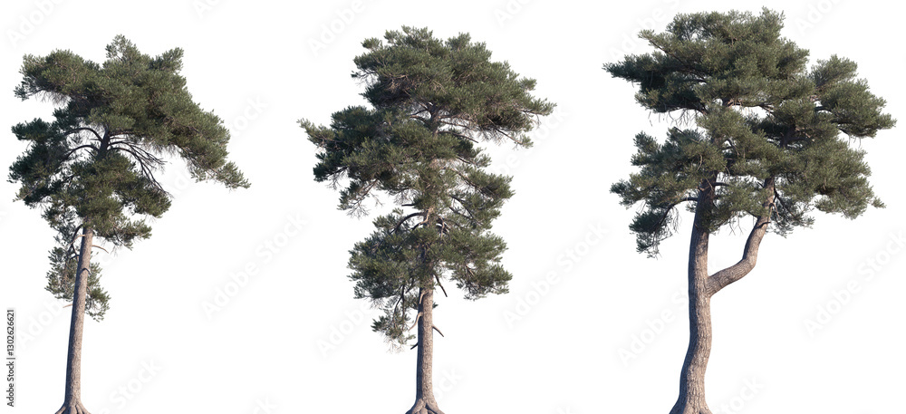 Set of Pinus sylvestris (the Scots pine, Scotch pine, Baltic pine, European red pine) frontal isolated png on a transparent background perfectly cutout #1302626621