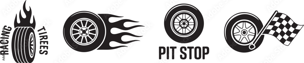 Set of racing car tires and checkered flag in silhouette style on transparent background #1936344246