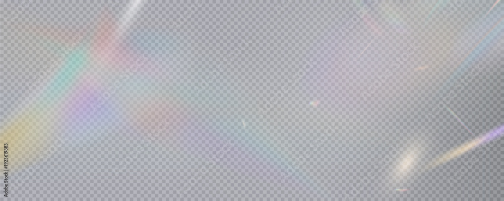 Set of rainbow light flares, reflection effect, falling confetti. Light rainbow lights with transparent effect, sparkling prism, stripe overlay, rainbow crystal, vector, png. #1923619883