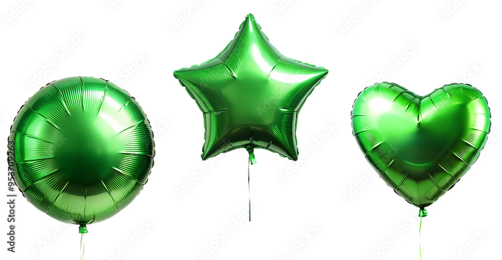 Set of realistic green heart, round and star shapes foil balloons isolated on cutout PNG. Helium green heart balloons clipart for anniversary, birthday, wedding, Christmas, card party. #953709263