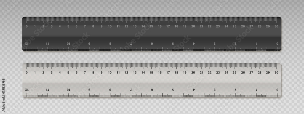 Set of realistic rulers 30 cm length. Plastic black and transparent ruler. School supplies and equipment. Measuring tool with double side scale. Vector illustration #1751333984