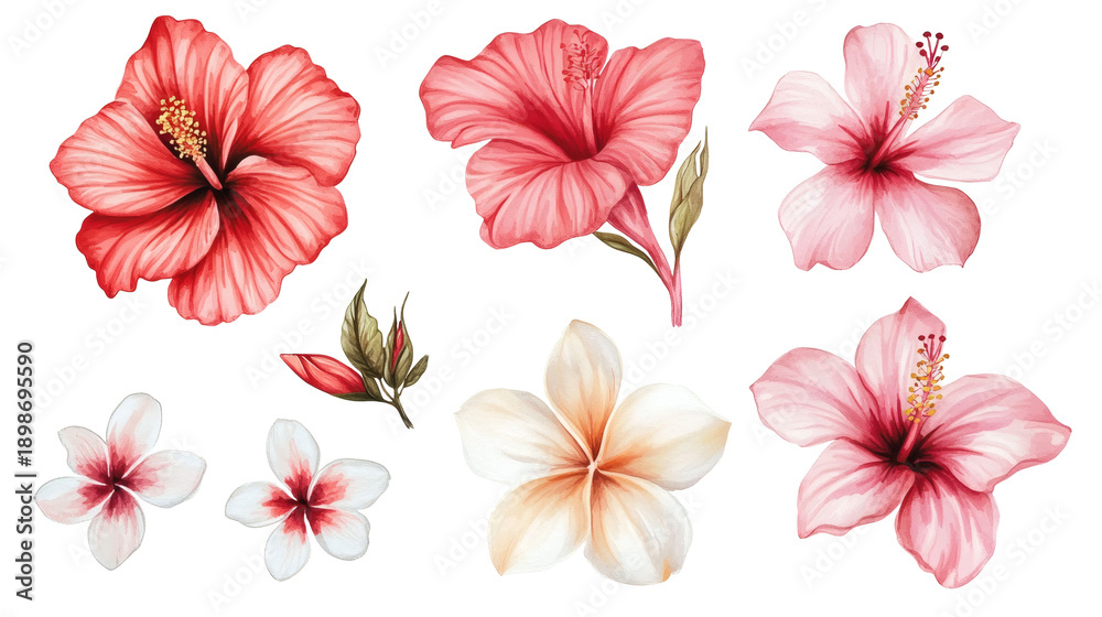 Set of red and pink hibiscus flowers with green leaves, watercolor botanical illustrations isolated on transparent background, tropical floral collection for design #1898695590