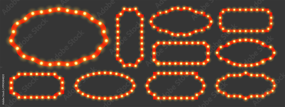 Set of retro glowing frames with light bulbs isolated on dark background for vintage signage, theater, carnival, holiday and promo design #1914384820