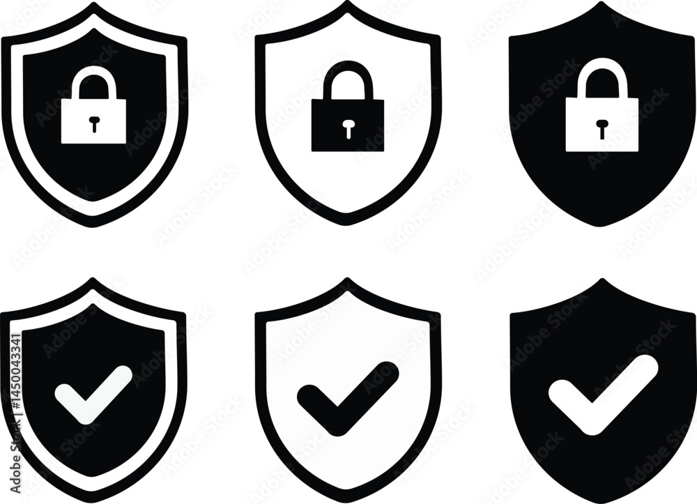 set of shield icons, shield black and white icon set, safety shield icon set, armor sign icon, shield label classic button icon, protection shield vector illustration, Security shield vector, #1450043341
