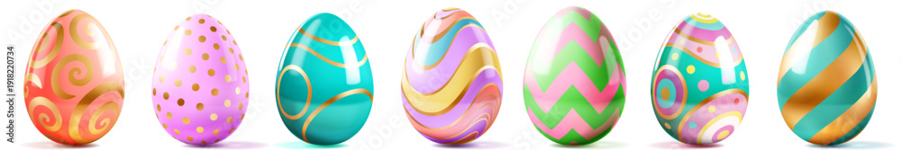 Set of shiny easter eggs with various patterns and soft shadows on white background, showcasing vibrant colors and ornate designs. #1918220734