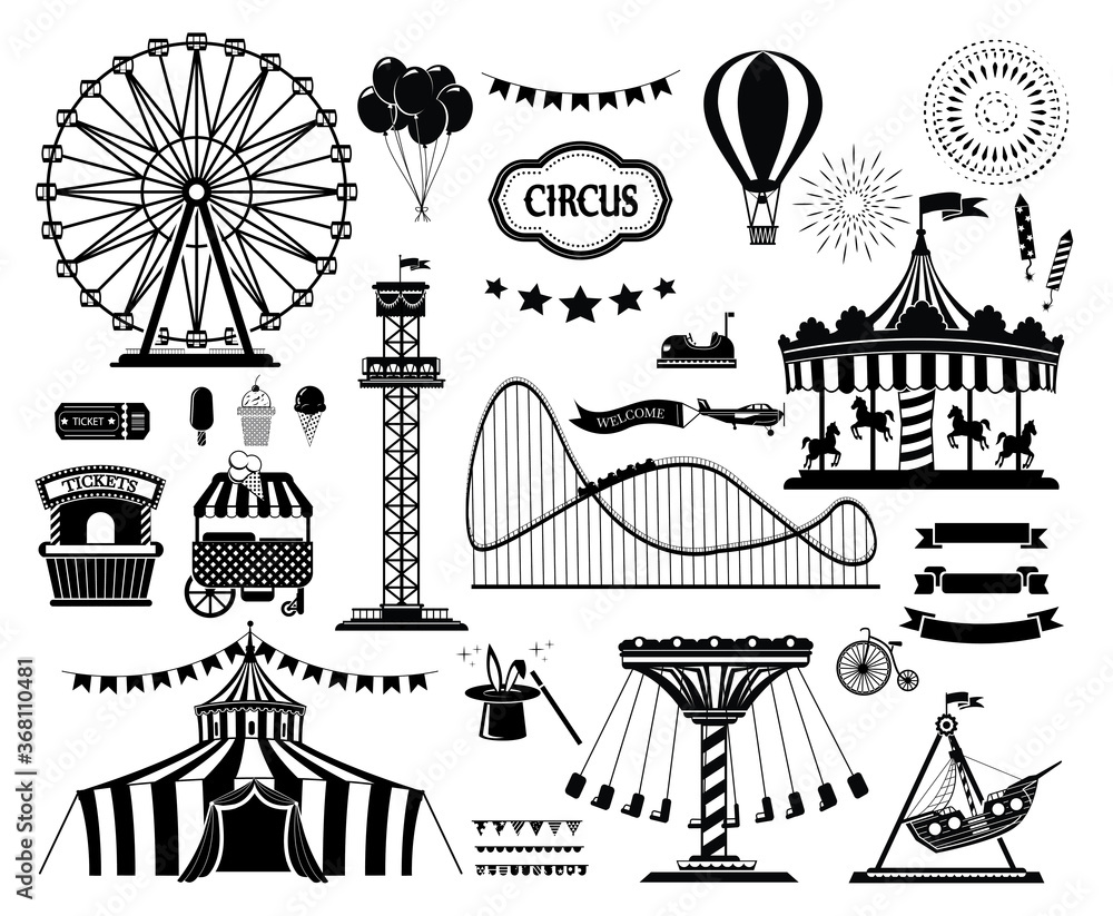 Set of silhouette icons of circus, amusement park. Carnival parks carousel attraction, fun rollercoaster and ferris wheel attractions. #368110481