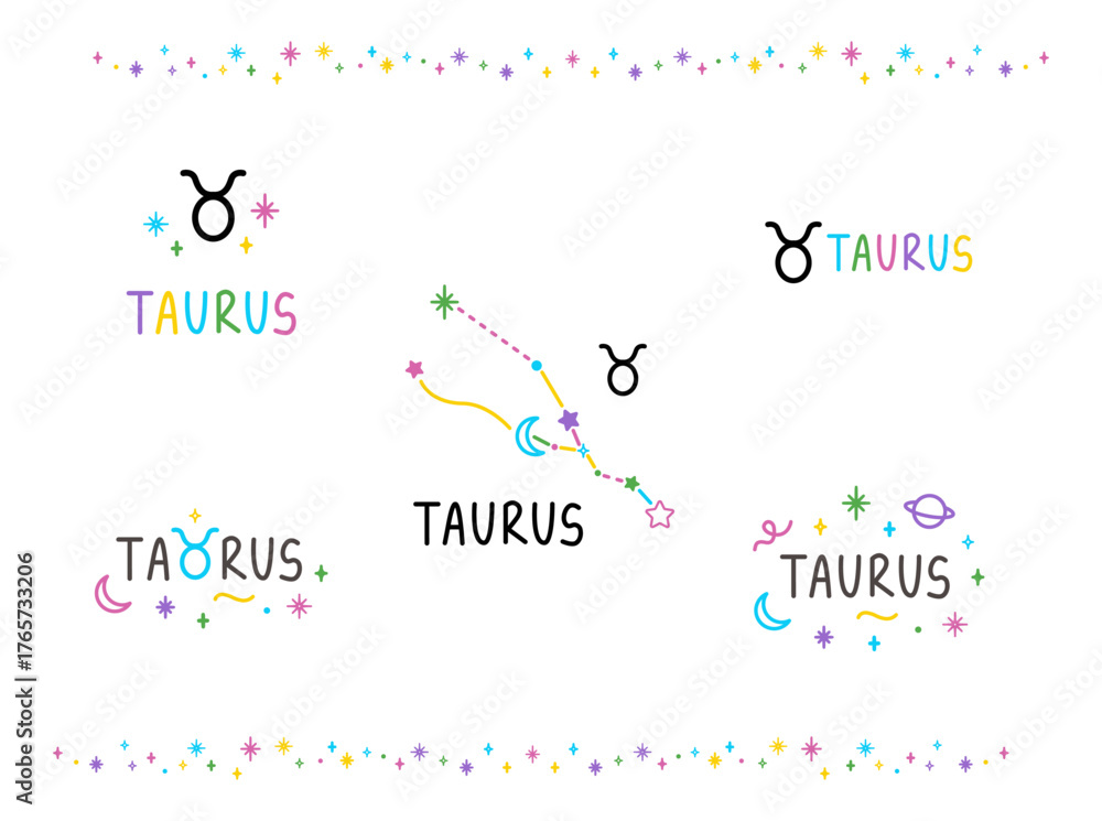 Set of Taurus zodiac sings. Colorful cartoon constellations and lettering sings. Hand drawn felt-tip pen talisman tattoo, logo, sticker. Isolated element. #1765733206