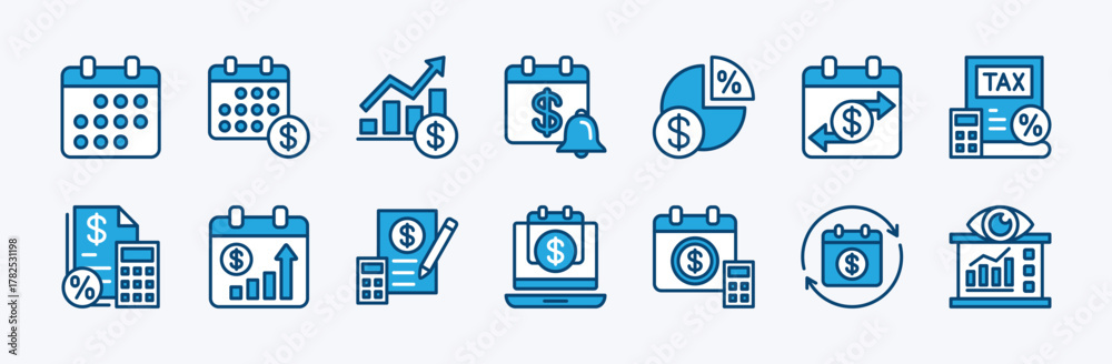 Set of tax day icon. Contains fiscal year calendar, calculate tax, statement, reminder, deadline, percentage invoice, growth income, rate, financial accounting report, audit, debt. Vector illustration #1782531198