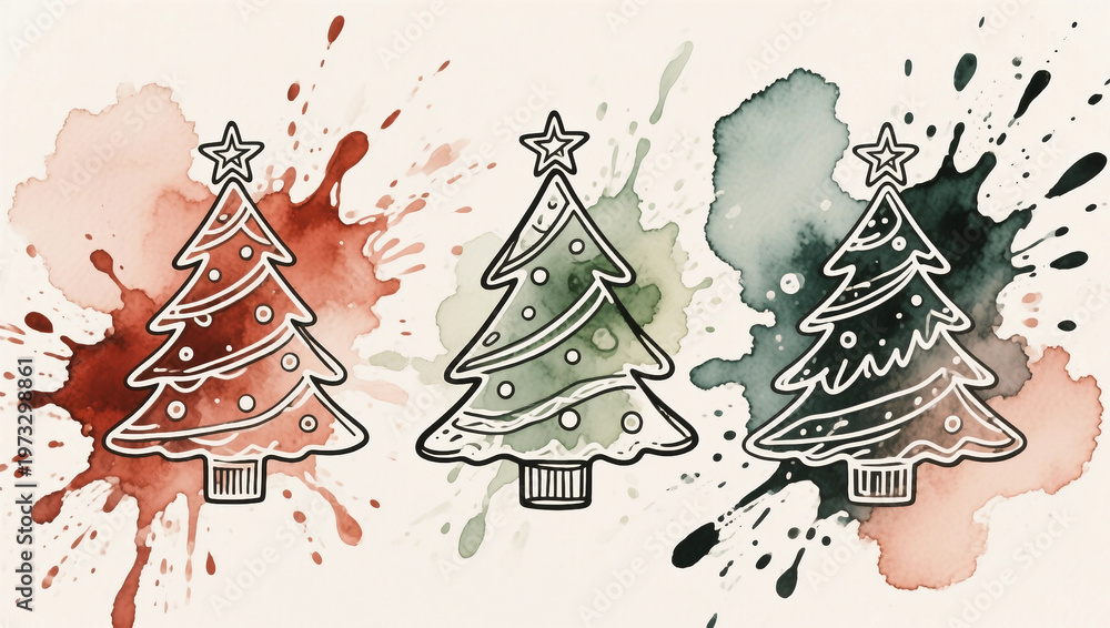 Set of three Christmas tree illustrations in line art style with watercolor splashes, perfect for holiday design, festive decoration and seasonal greeting cards. #1973298861