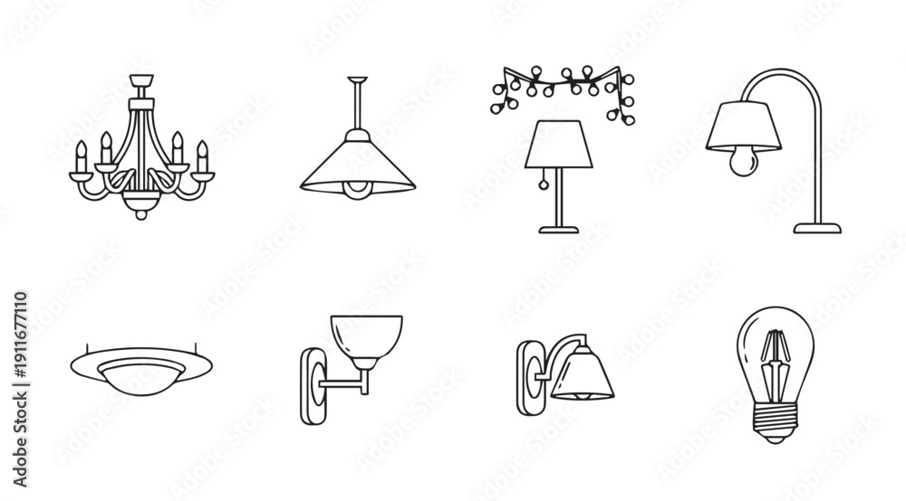 Set of various lighting fixtures and bulbs, line art illustrations, interior design elements #1911677110
