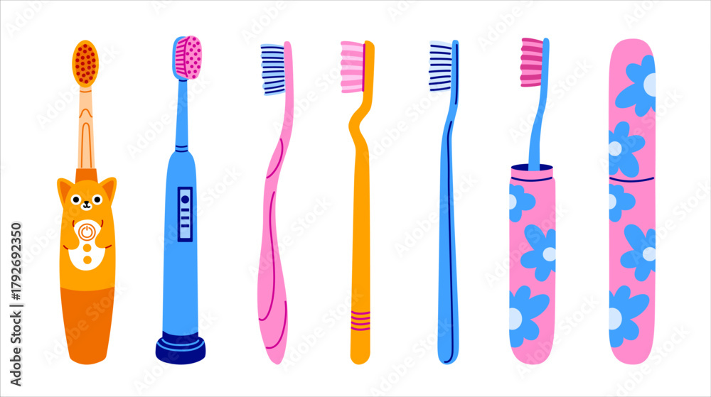 Set of various toothbrushes. Electric, manual, kids toothbrush types. Colorful set of vector hand drawn isolated illustration. #1792692350