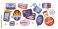 Set sardines and seafood in cans canned. Cartoon stickers of fish products packaging in bright doodle. Tuna, salmon, shrimp, octopus. Vector shapes stickers #1777895054