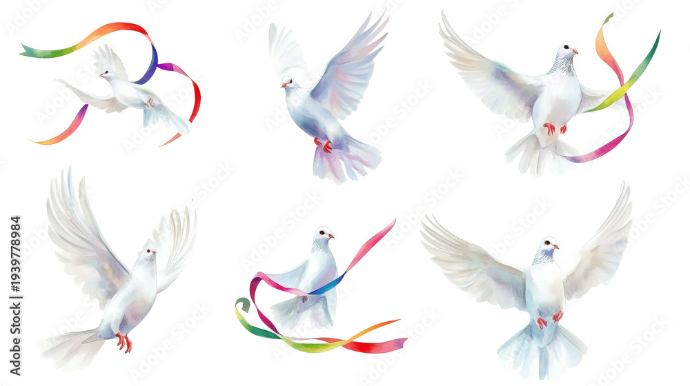 Seven white doves in flight with colorful ribbon accents on transparent background, watercolor style, soft lighting, elegant motion #1939778984