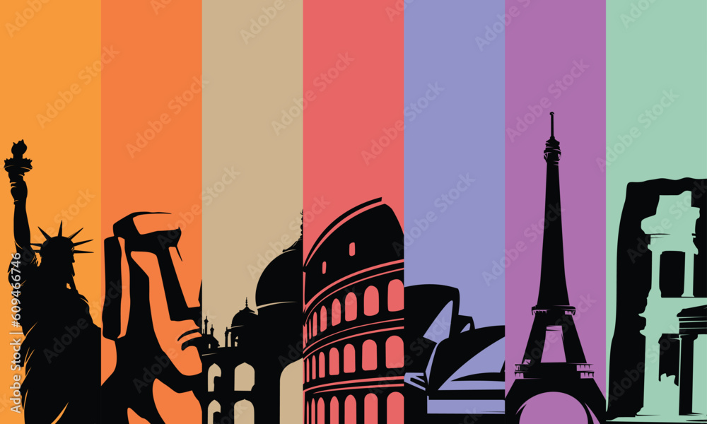 • #609466746 seven wonders of World, Travel and tourism background around the world-vector eps10