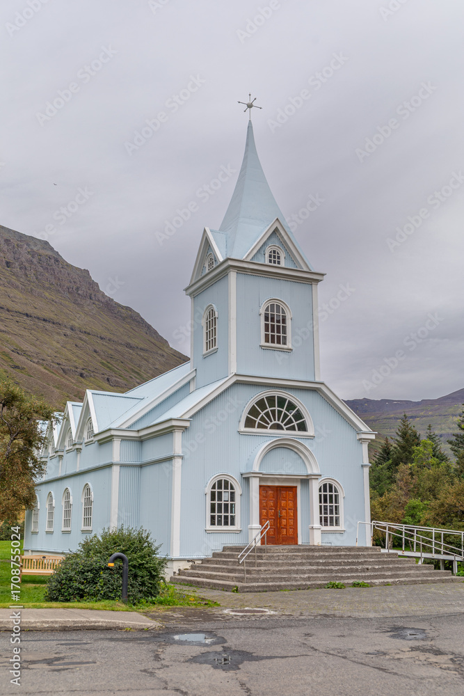 Seyðisfjarðarkirkja, l'église aux murs de tôle bleu ciel de Seyðisfjörður, petit village au fond d'un fjord, dans l'est de l'Islande #1708755024