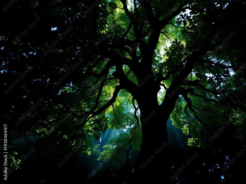 Shadow-drenched emerald canopy, stark trunk emerging from abyss, dynamic, graphic #1938484417