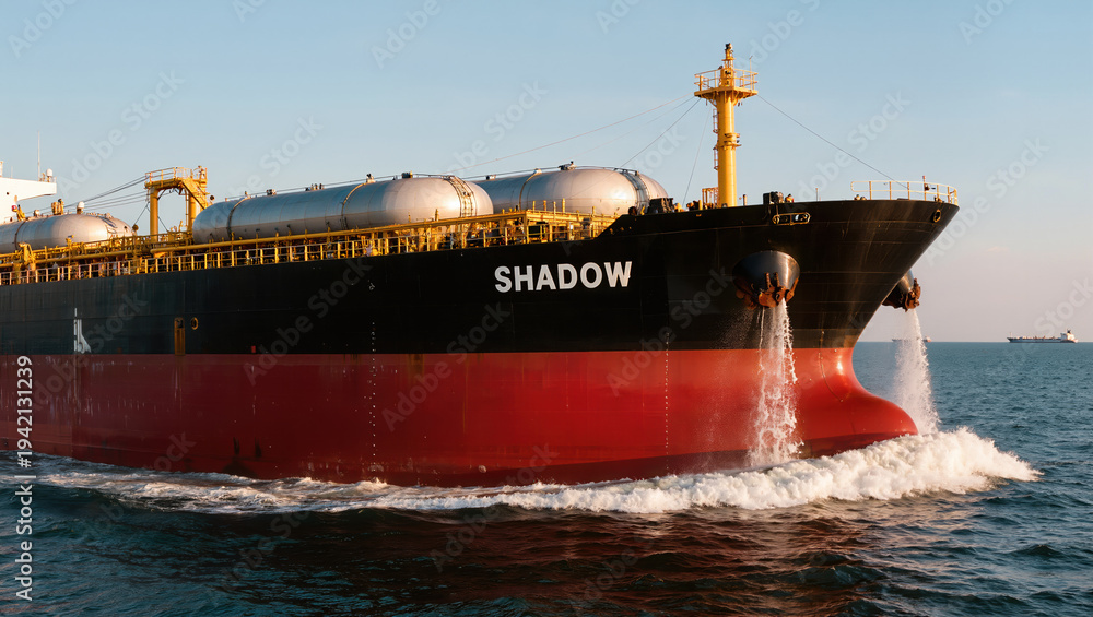 Shadow fleet oil tanker navigating international waters. Black and red merchant vessel discharging ballast from bow during transit. #1942131239