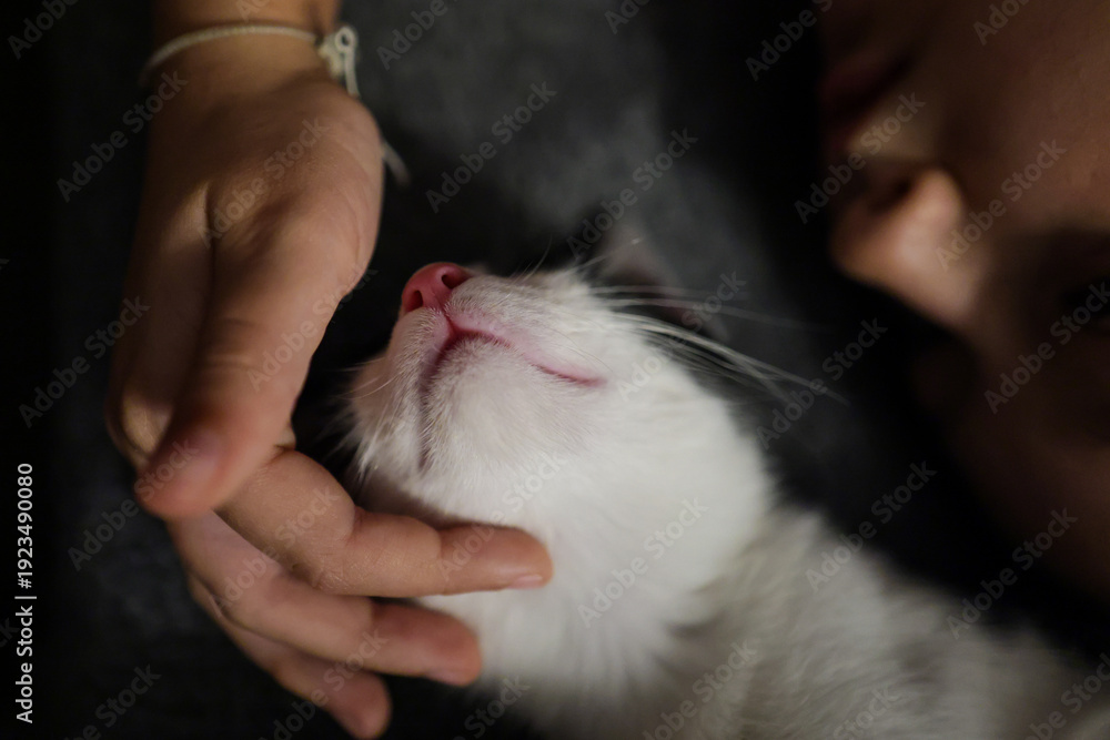 Shallow depth of field (selective focus) details with a kitten sleeping and a young girl petting it #1923490080
