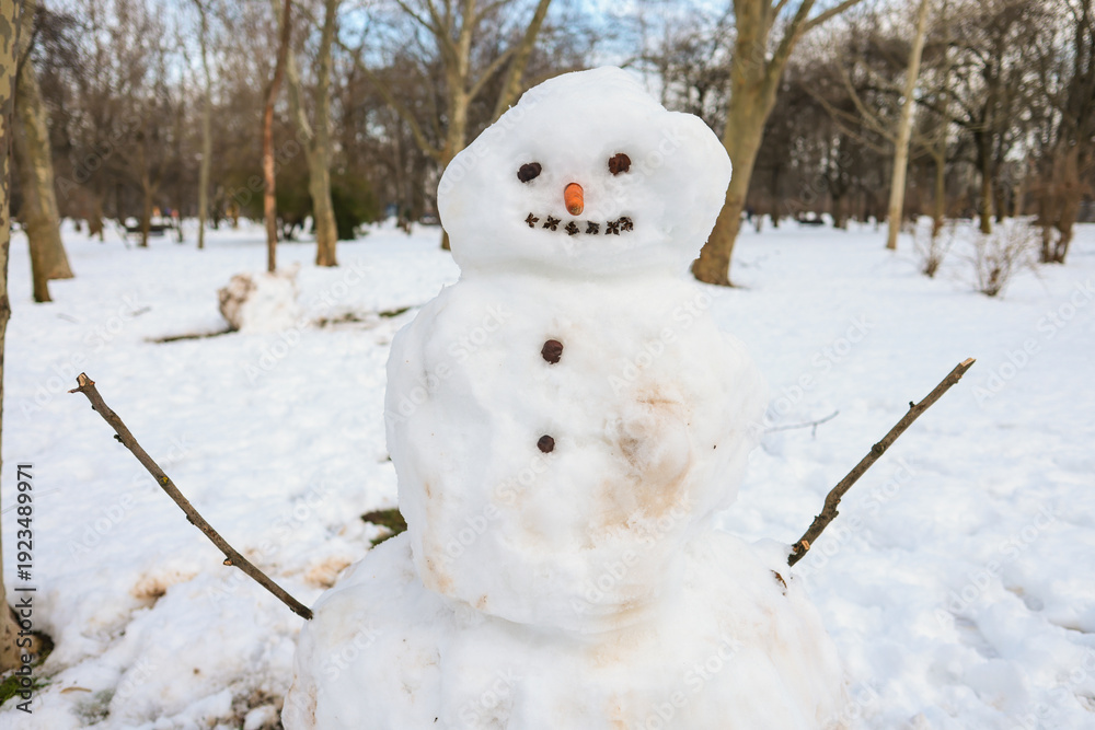 Shallow depth of field (selective focus) details with a snowman with carrot nose and chestnut eyes #1923489971