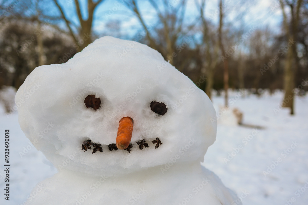Shallow depth of field (selective focus) details with a snowman with carrot nose and chestnut eyes #1923490018