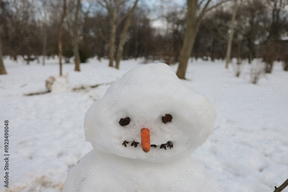 Shallow depth of field (selective focus) details with a snowman with carrot nose and chestnut eyes #1923490048