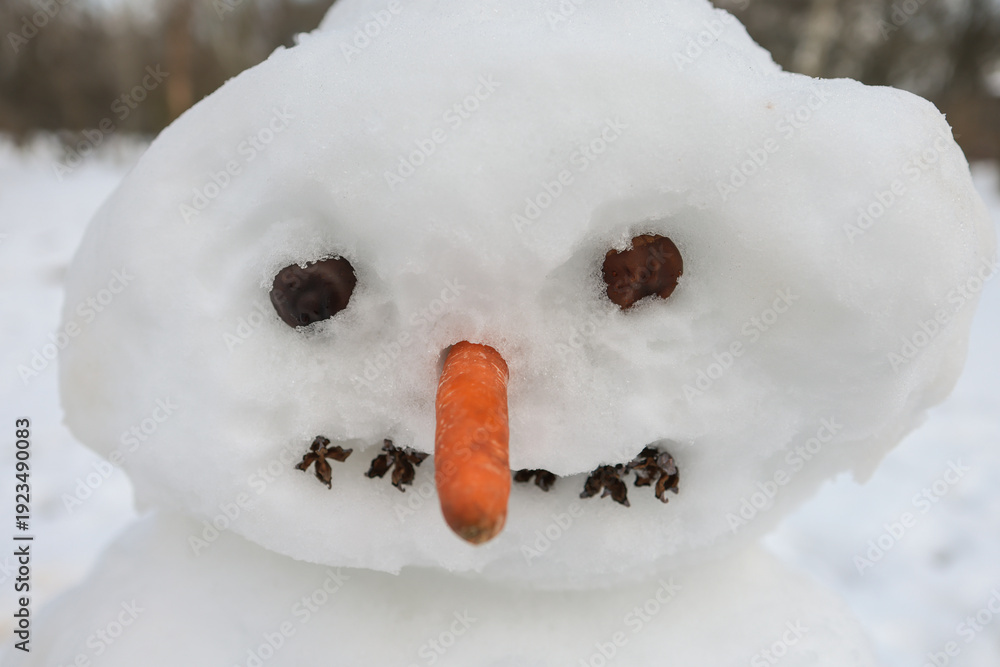 Shallow depth of field (selective focus) details with a snowman with carrot nose and chestnut eyes #1923490083