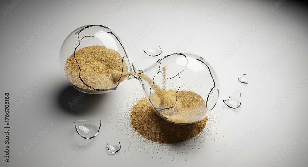 Shattered hourglass with golden sand spilling, symbolizing urgency and lost time #1766703188