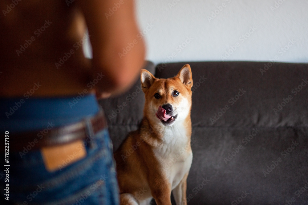 Shiba Inu Dog Licking Lips While Looking at Owner #1782237190