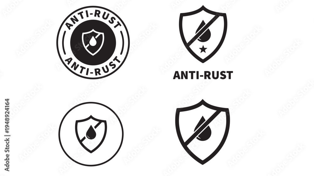 Shields with drop icons and anti rust text in various styles, representing protection against corrosion and moisture. #1948924164