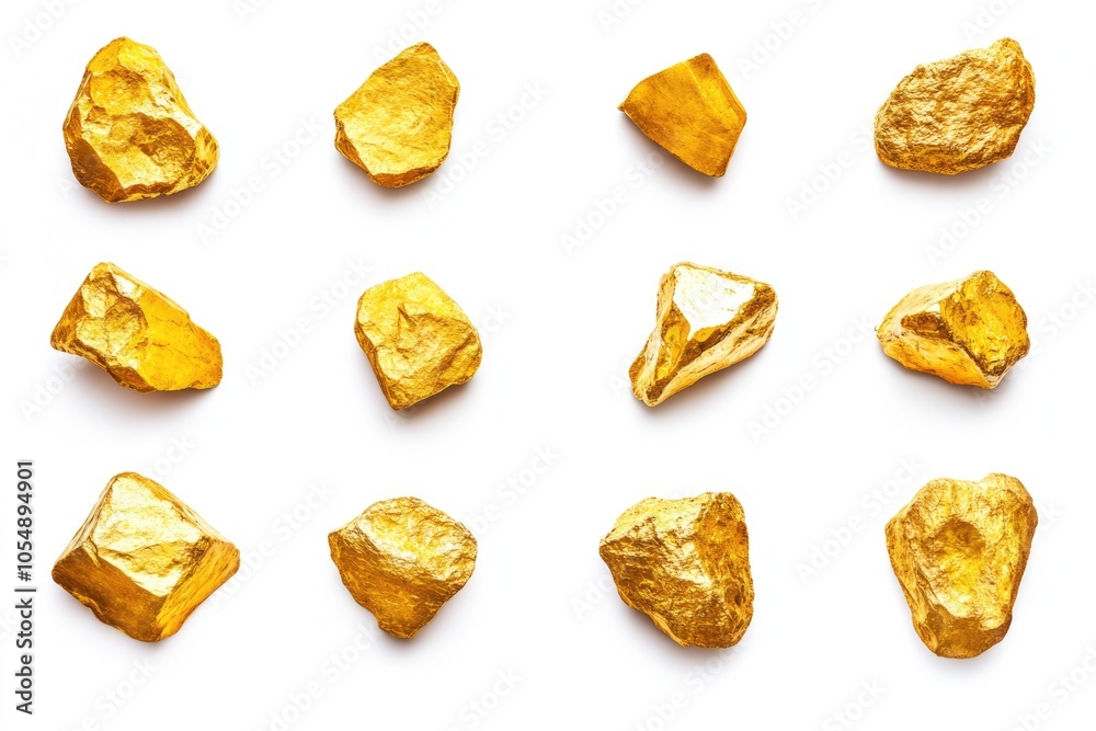 Shiny golden nuggets on white background gold ore samples. #1054894901