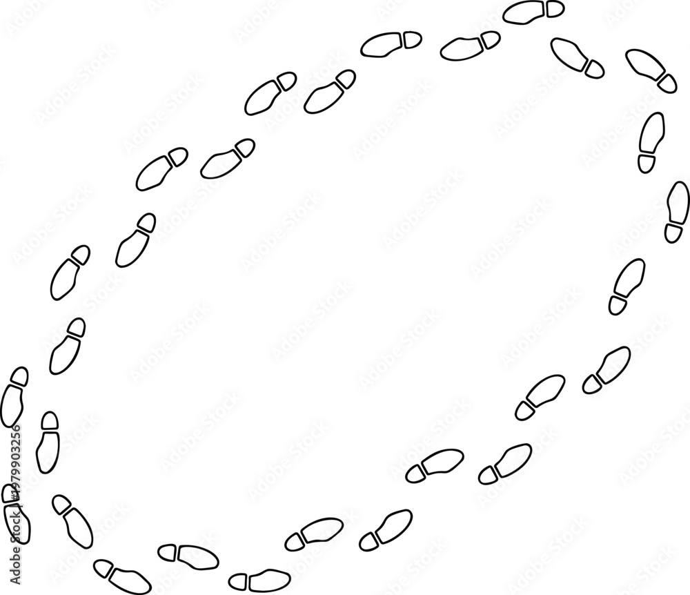 Shoe print outline oval, thin line footprint track path set on white background. Minimalist walking person steps, shoe print outline, human boot mark shape. Footwear line art #1979903256