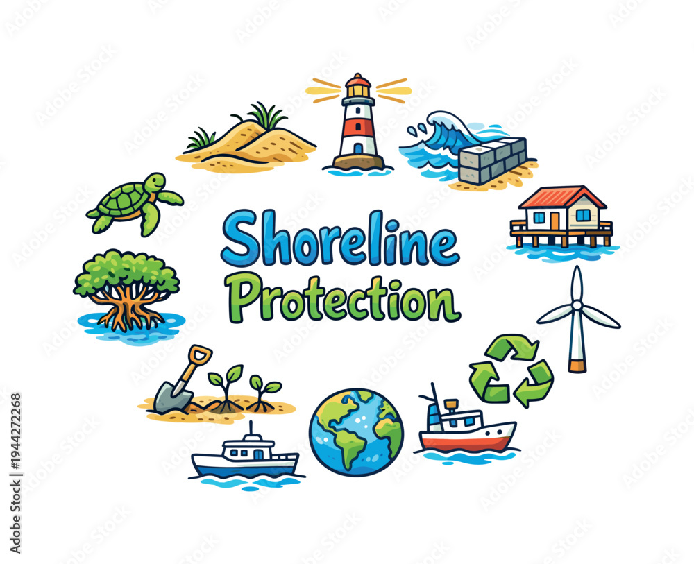 Shoreline Protection. Hand drawn illustration of Shoreline Protection. sand dunes, sea wall barrier, ocean #1944272268