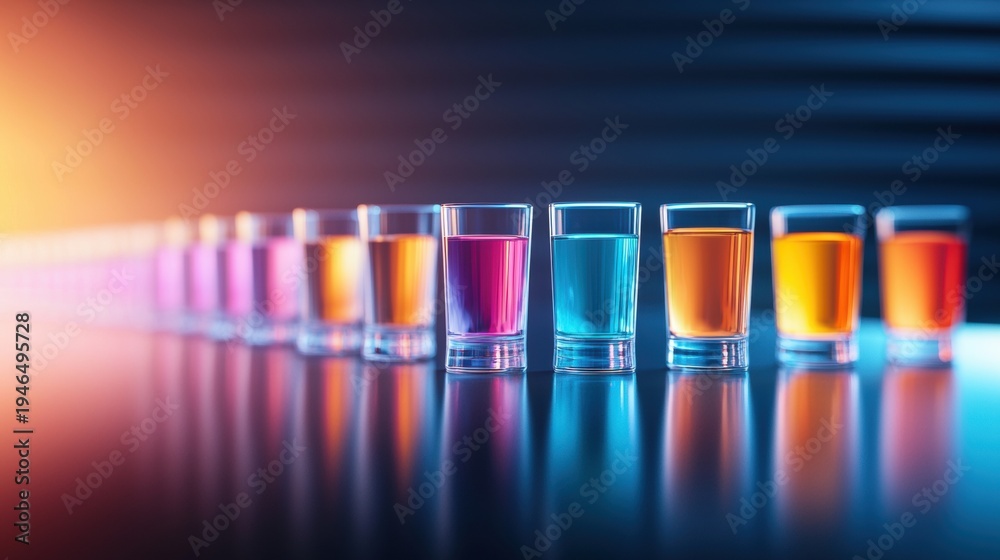 Shot Multiple shot glasses filled with colorful drinks lined up on a reflective bar counter #1946495728