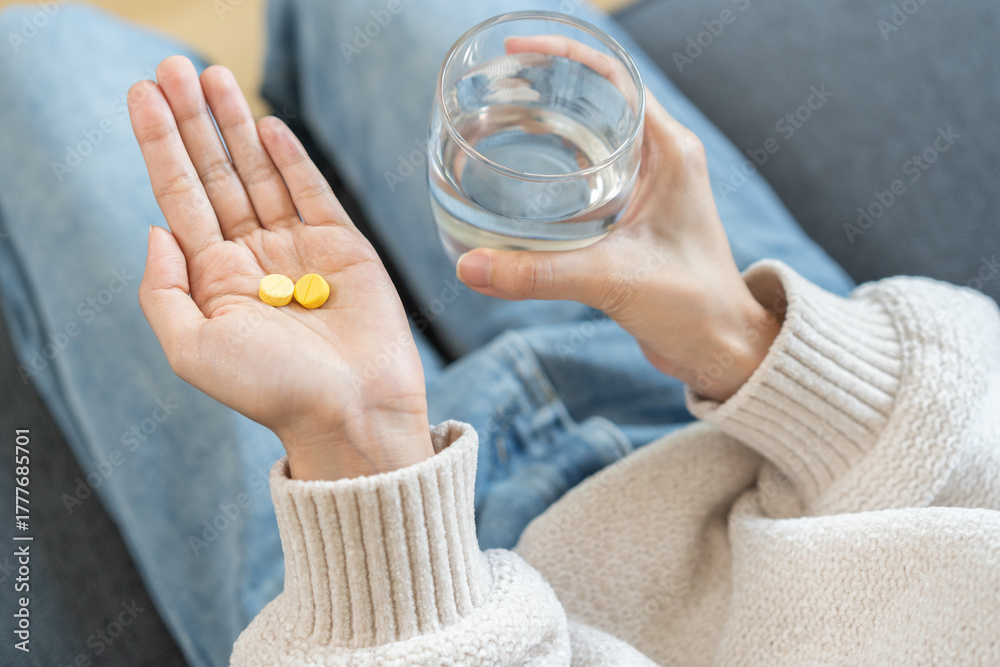 Sick, asian young woman, girl hand holding pill capsule, painkiller medicine from stomach pain, head ache, pain for treatment, take drug or vitamin and glass of water at home, pharmacy and health care #1777685701