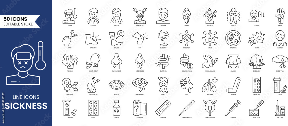 Sickness line editable icon set. Containing fever, allergy, sneeze, infection, diarrhea, flu, pain, dizziness and more. Vector illustration #1499855277