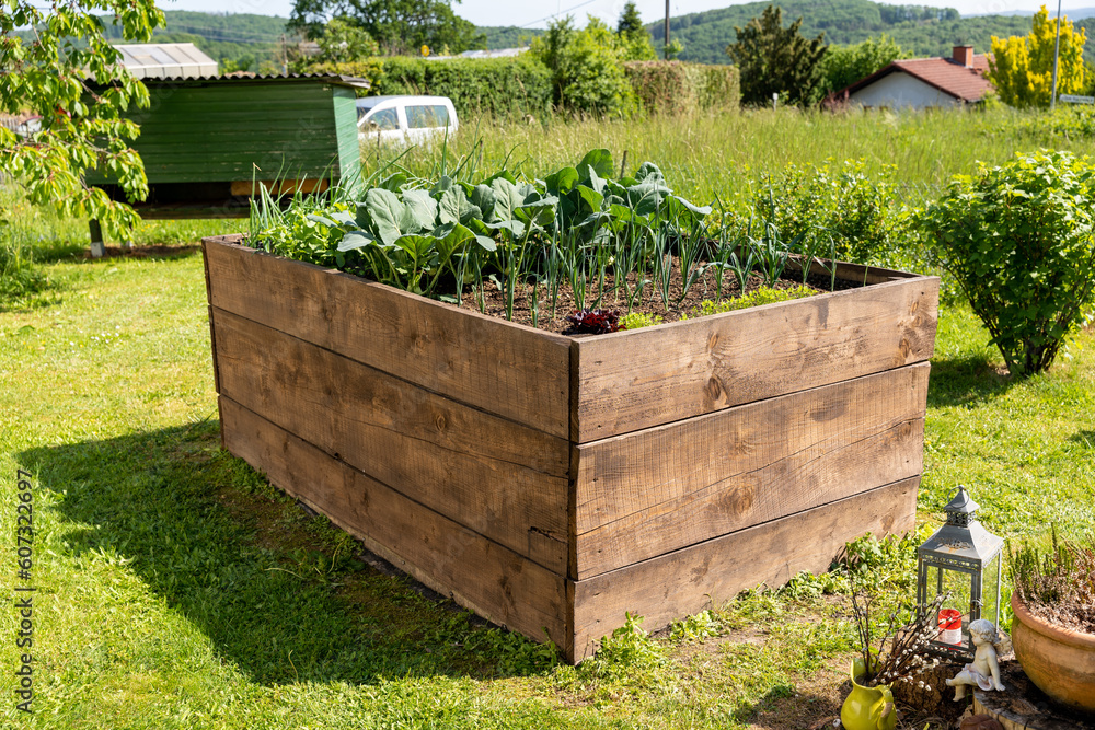 Side view on a wooden raised bed in the garden with young plants growing inside the bed as a smbol for gardening and self supply #607322697