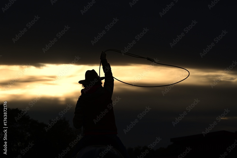 Silhouette einer Lasso schwingenden Person auf einem Pferd von hinten im Sonnenuntergang #1763872176