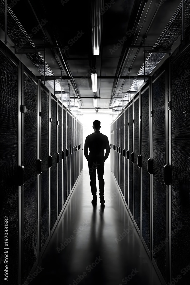 Silhouette eines Mannes im Rechenzentrum zwischen Servern mit futuristischer Stimmung #1970331582