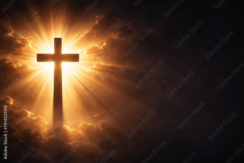 Silhouette of a Christian cross with dramatic celestial light at dawn, symbol of faith, hope, and resurrection at Easter, spiritual image #1914521318