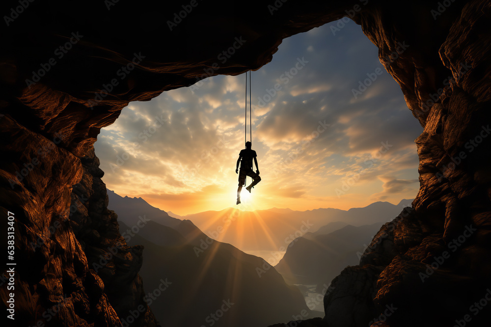 Silhouette of a climber delicately balancing on a slim mountain ledge, conveying the fragile dance between risk and reward #638313407