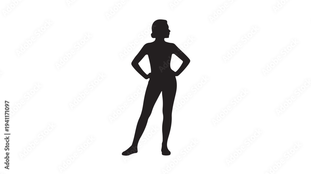 Silhouette of a confident woman standing with hands on hips in dramatic pose with deep black color on white background for fitness advertising #1941171097